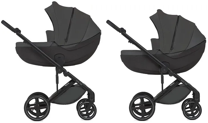 W wózku Mev przy pomocy załączonych w zestawie adapterów można dopasować wysokość gondoli i siedziska do wzrostu rodzica.