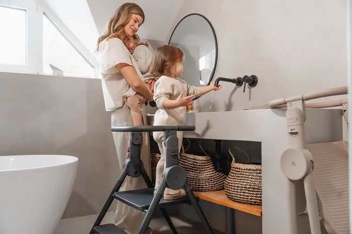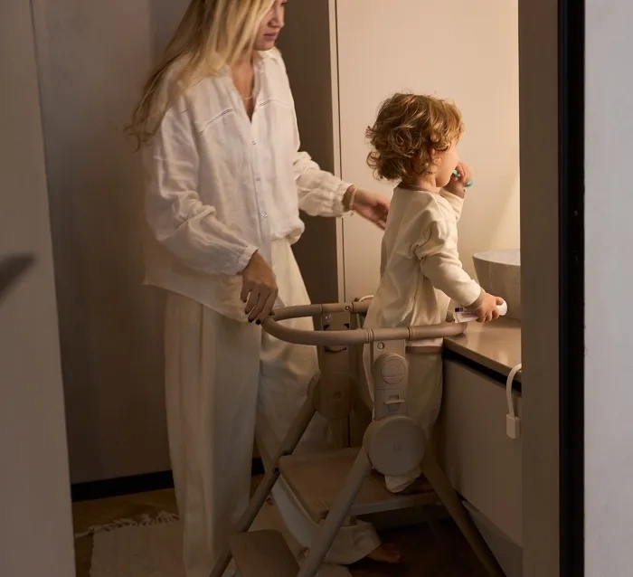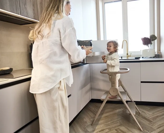 Dzięki barierkom zabezpieczającym i wyjmowanemu bumperowi, maluch może w pełni uczestniczyć w codziennych aktywnościach – gotowaniu, myciu rączek czy zabawie przy blacie.