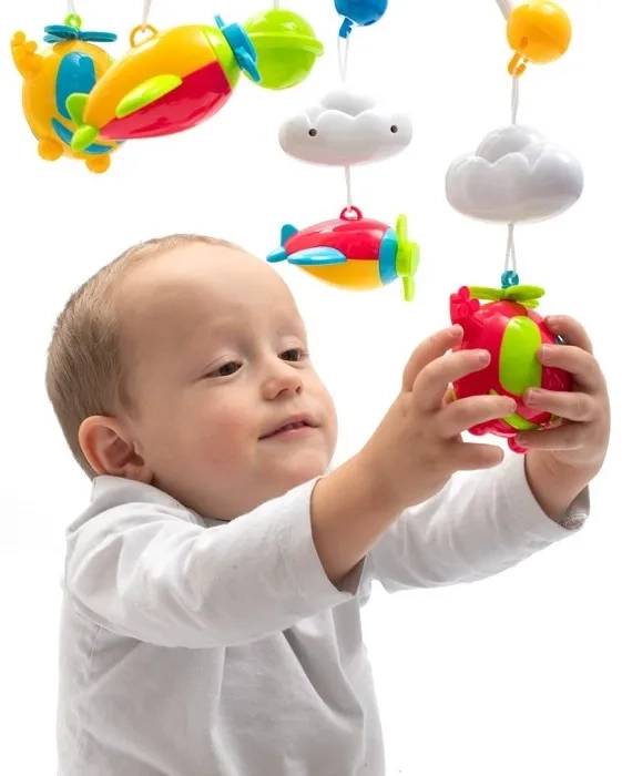 Do karuzelki dołączone są kolorowe zabawki o wysokości 10 cm, które przyciągają uwagę dziecka i zachęcają do obserwacji.