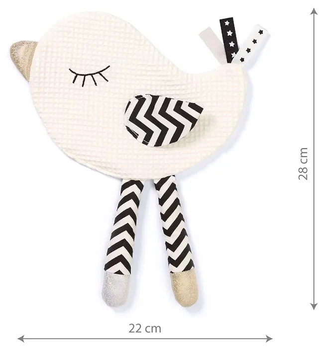 Kształt ptaszka z wystającymi elementami wspiera rozwój umiejętności motorycznych.