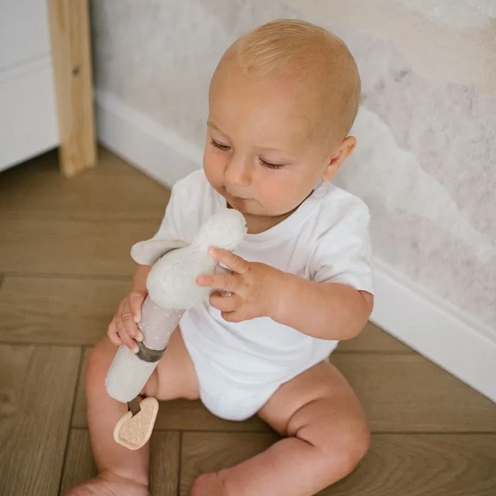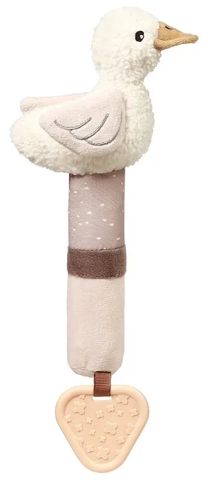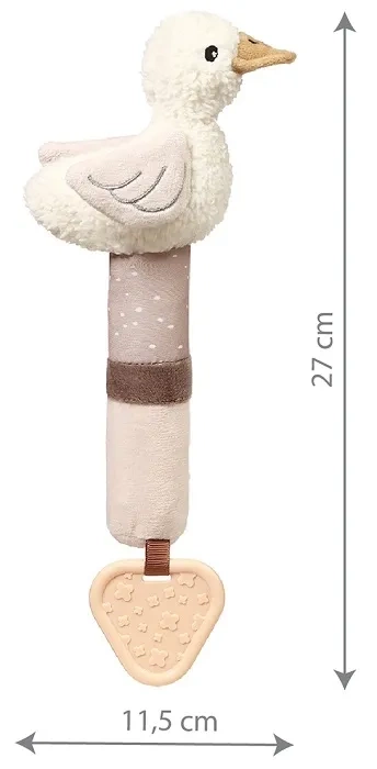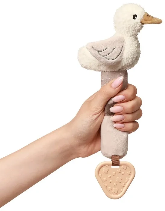 Kontrastowy dziób gąski pobudza zmysł wzorku, a miękkie, szeleszczące skrzydła pozwalają na ćwiczenie chwytu dziecka.