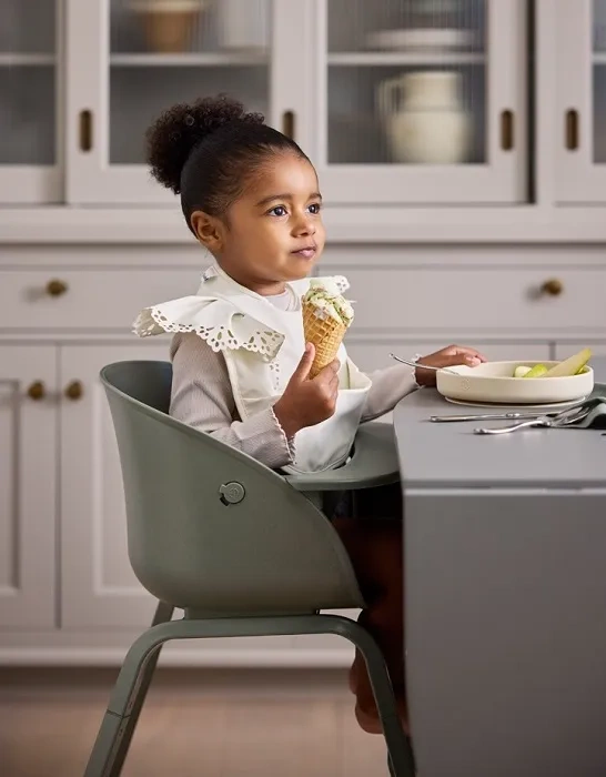 Dziecko zasiada razem z domownikami, co sprzyja wspólnym posiłkom i budowaniu rodzinnych rytuałów.