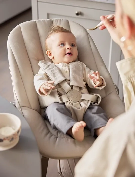 Dzięki zdejmowanej tacy i osobnej barierce krzesełko można łatwo dosunąć bezpośrednio do stołu.