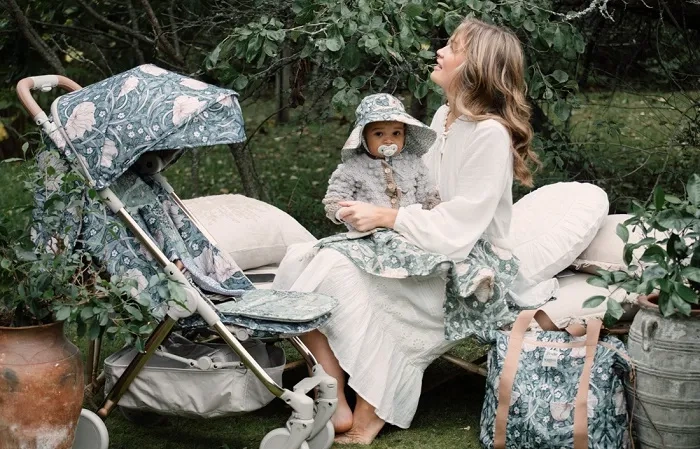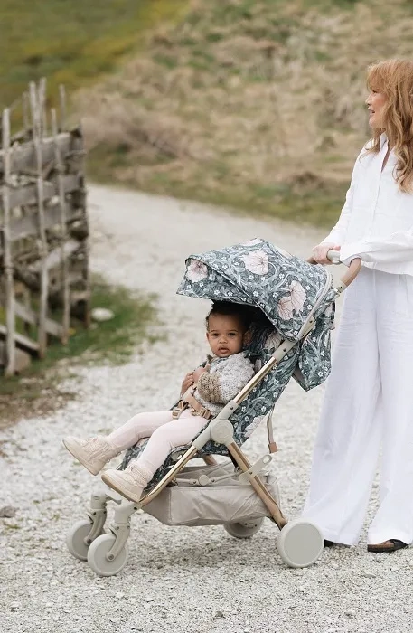 Rozkładany daszek z tkaniny z filtrem UPF 50+ zapewni Twojemu dziecku ochronę przed szkodliwym promieniowaniem w słoneczne dni.