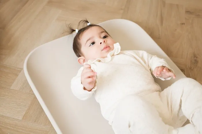 Stabilność podczas użytkowania zapewniają niewielkie, gumowe nóżki umieszczone na spodzie maty, dzięki którym przewijak nie przesuwa się nawet na śliskich powierzchniach.