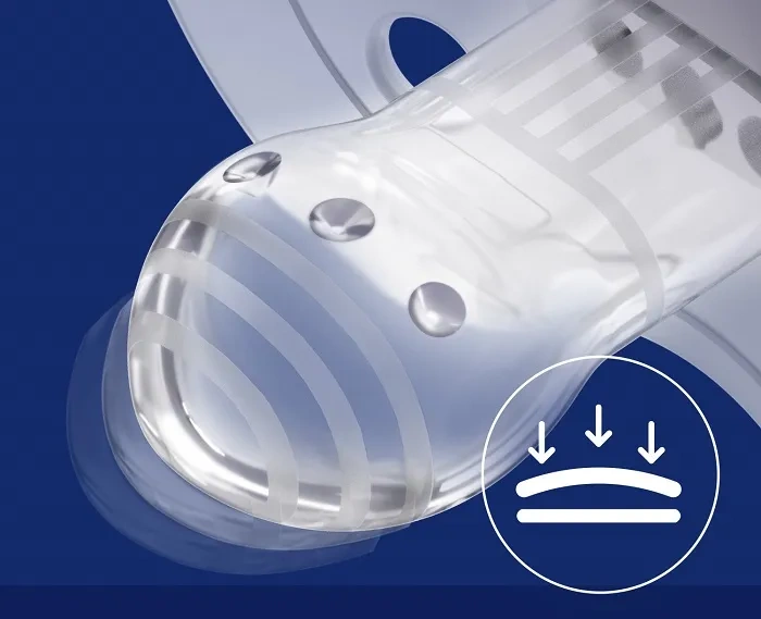 Gumka smoczka ma symetryczny kształt inspirowany kształtem brodawki sutkowej wypełnionej mlekiem, co zapewnia dziecku znajome odczucia - podobne, jak przy piersi.