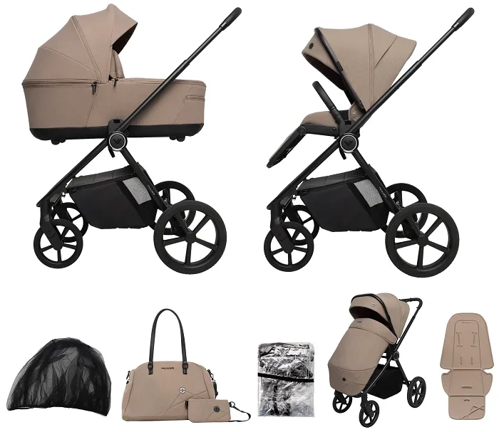 W zestawie znajduje się: wkładka do spacerówki, moskitiera, folia przeciwdeszczowa, blenda przeciwsłoneczna, torba z poręczną saszetką na telefon, etui na smoczek oraz ocieplane okrycie na nóżki.