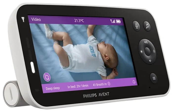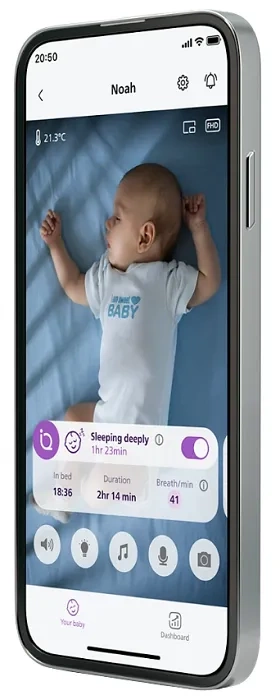 Obserwuj fazy snu i częstość oddechów na swoim telefonie, z poziomu aplikacji Baby Monitor+ lub na dużym, 5-calowym ekranie Full HD.