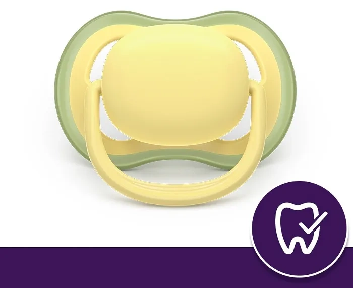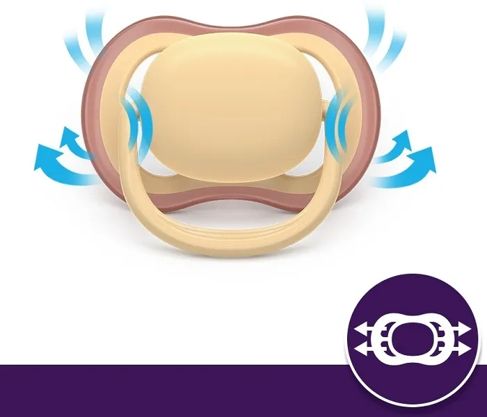 Smoczek ortodontyczny Phlips Avent Ultra Air jest symetryczny i miękki, dlatego wspiera naturalny rozwój jamy ustnej.