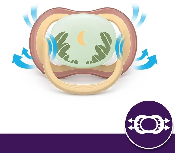 Smoczki Philips Avent Ultra Air Day & Night, dzięki bardzo dużym otworom zapewniającym przepływ powietrza, pozwalają skórze dziecka oddychać. Dzięki temu pozostaje ona sucha i nie ulega podrażnieniom w swych najdelikatniejszych obszarach. Załączone w zestawie etui to nie tylko praktyczny pojemnik na smoczki, ale także podręczne urządzenie do ich sterylizowania.