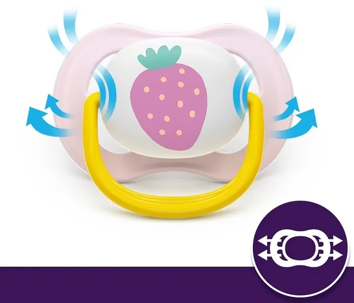 Smoczki Philips Avent Ultra Air, dzięki bardzo dużym otworom zapewniającym przepływ powietrza, pozwalają skórze dziecka oddychać. Dzięki temu pozostaje ona sucha i nie ulega podrażnieniom w swych najdelikatniejszych obszarach. Załączone w zestawie etui to nie tylko praktyczny pojemnik na smoczki, ale także podręczne urządzenie do ich sterylizowania.