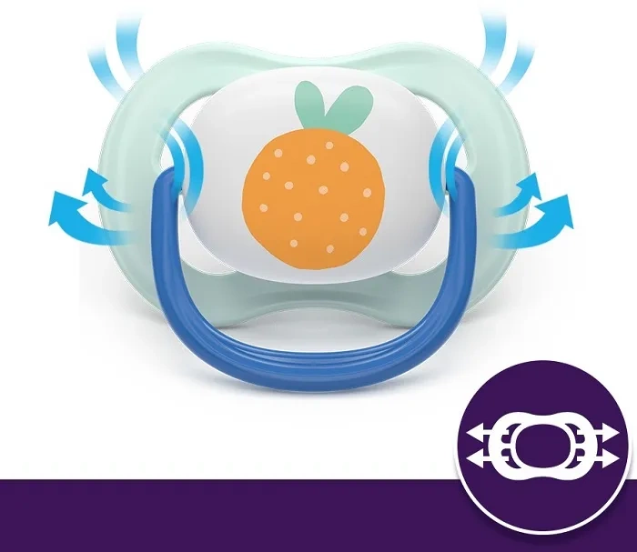 Smoczki Philips Avent Ultra Air, dzięki bardzo dużym otworom zapewniającym przepływ powietrza, pozwalają skórze dziecka oddychać. Dzięki temu pozostaje ona sucha i nie ulega podrażnieniom w swych najdelikatniejszych obszarach. Załączone w zestawie etui to nie tylko praktyczny pojemnik na smoczki, ale także podręczne urządzenie do ich sterylizowania.