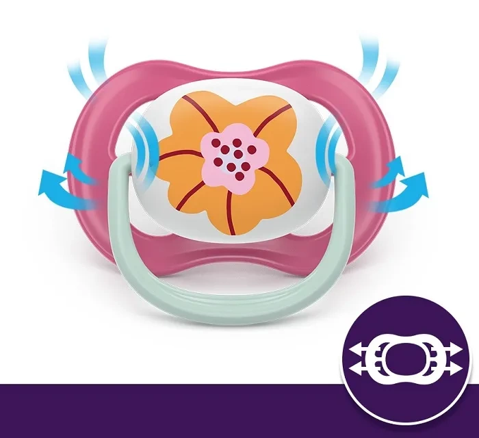 Smoczki Philips Avent Ultra Air, dzięki bardzo dużym otworom zapewniającym przepływ powietrza pozwalają skórze dziecka oddychać. Dzięki temu pozostaje ona sucha i nie ulega podrażnieniom w swych najdelikatniejszych obszarach. Załączone w zestawie etui to nie tylko praktyczny pojemnik na smoczki, ale także podręczne urządzenie do ich sterylizowania.