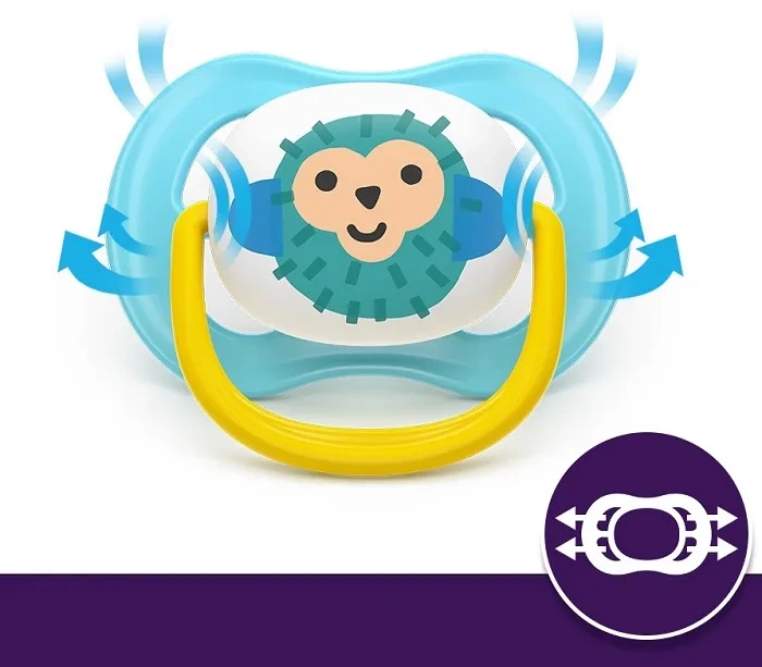 Smoczki Philips Avent Ultra Air, dzięki bardzo dużym otworom zapewniającym przepływ powietrza pozwalają skórze dziecka oddychać. Dzięki temu pozostaje ona sucha i nie ulega podrażnieniom w swych najdelikatniejszych obszarach. Załączone w zestawie etui to nie tylko praktyczny pojemnik na smoczki, ale także podręczne urządzenie do ich sterylizowania.