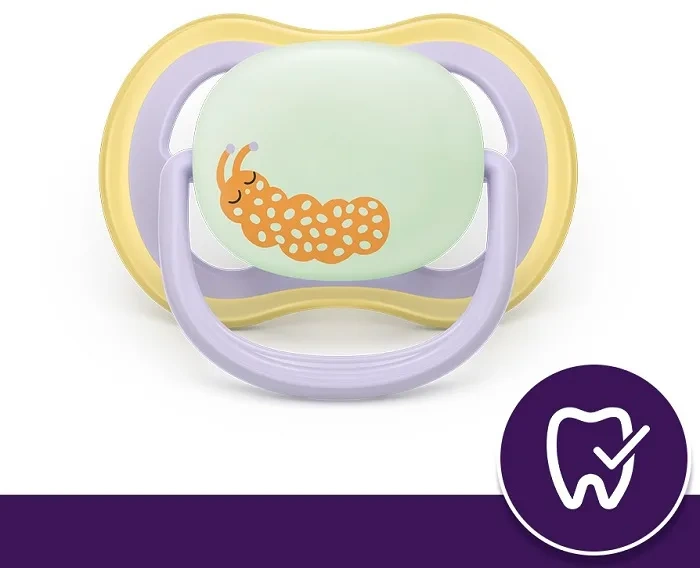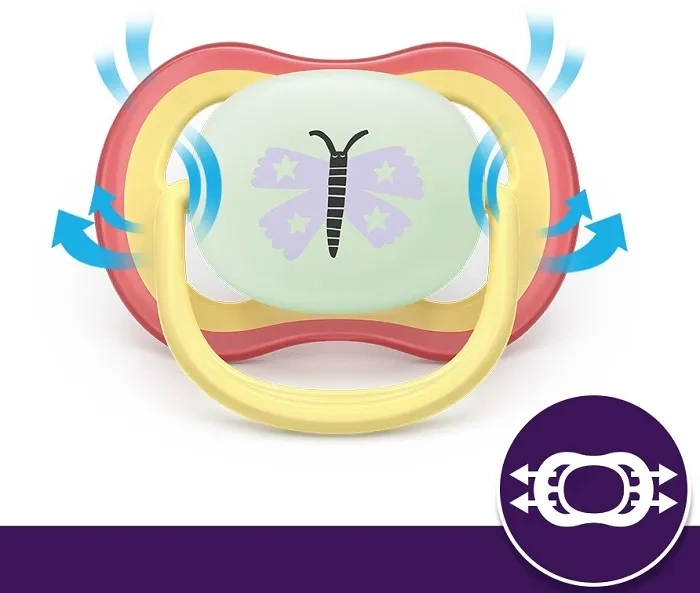 Smoczek ortodontyczny Phlips Avent Ultra Air jest symetryczny i miękki, dlatego wspiera naturalny rozwój jamy ustnej.