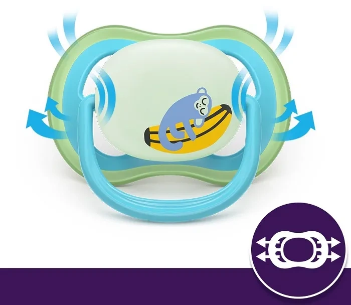 Smoczki Philips Avent Ultra Air, dzięki bardzo dużym otworom zapewniającym przepływ powietrza pozwalają skórze dziecka oddychać. Dzięki temu pozostaje ona sucha i nie ulega podrażnieniom w swych najdelikatniejszych obszarach. Świecąca tarczka umożliwia łatwe odnalezienie smoczka w ciemności, a załączone w zestawie etui to nie tylko praktyczny pojemnik na smoczki, ale także podręczne urządzenie do ich sterylizowania.