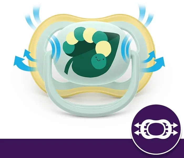 Smoczek ortodontyczny Phlips Avent Ultra Air jest symetryczny i miękki, dlatego wspiera naturalny rozwój jamy ustnej.