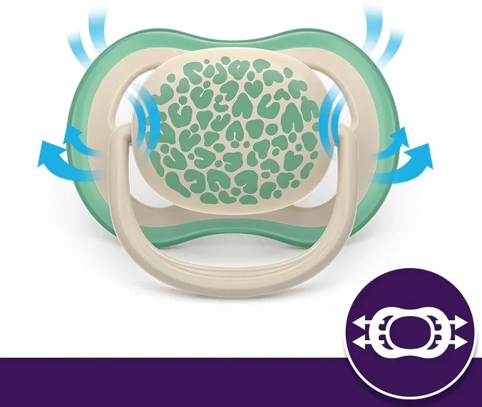 Smoczki Philips Avent Ultra Air, dzięki bardzo dużym otworom zapewniającym przepływ powietrza pozwalają skórze dziecka oddychać. Dzięki temu pozostaje ona sucha i nie ulega podrażnieniom w swych najdelikatniejszych obszarach. Załączone w zestawie etui to nie tylko praktyczny pojemnik na smoczki, ale także podręczne urządzenie do ich sterylizowania.