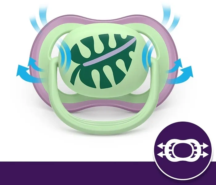 Smoczki Philips Avent Ultra Air, dzięki bardzo dużym otworom zapewniającym przepływ powietrza pozwalają skórze dziecka oddychać. Dzięki temu pozostaje ona sucha i nie ulega podrażnieniom w swych najdelikatniejszych obszarach. Załączone w zestawie etui to nie tylko praktyczny pojemnik na smoczki, ale także podręczne urządzenie do ich sterylizowania.