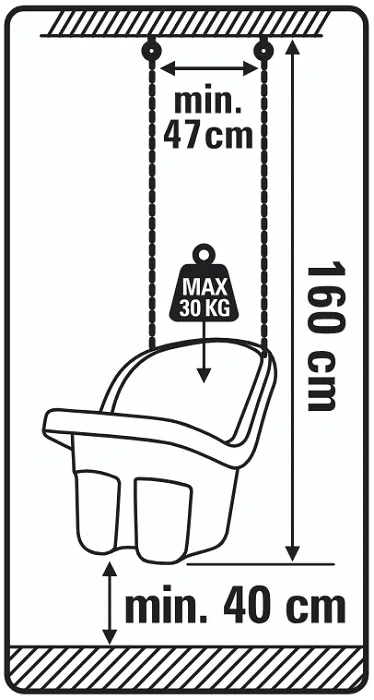 Huśtawkę należy zamontować tak, aby siedzisko znajdowało się co najmniej 40 cm nad podłożem, a odstęp boczny od przeszkód wynosił minimum 70 cm.