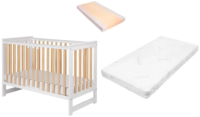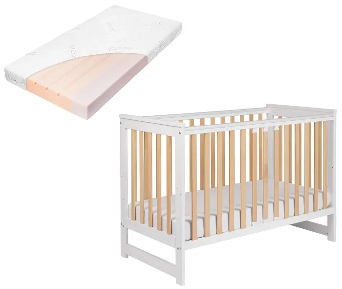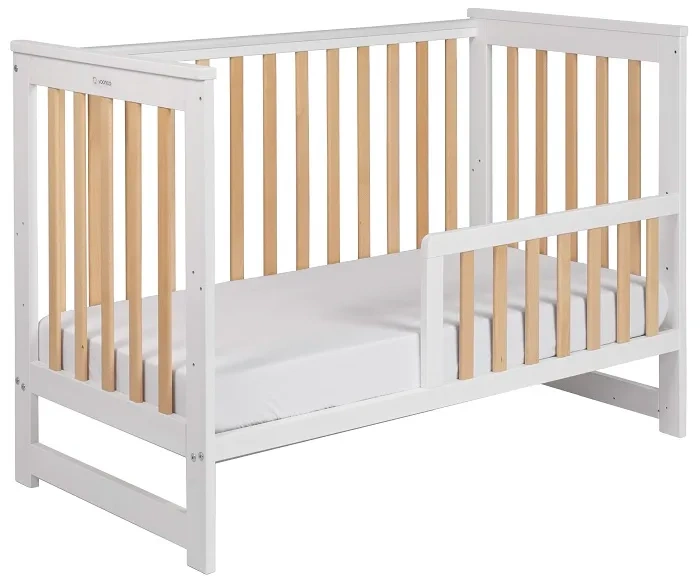 YOONCO - łóżeczko drewniane Iwi z barierką + materac Air | Białe-Buk