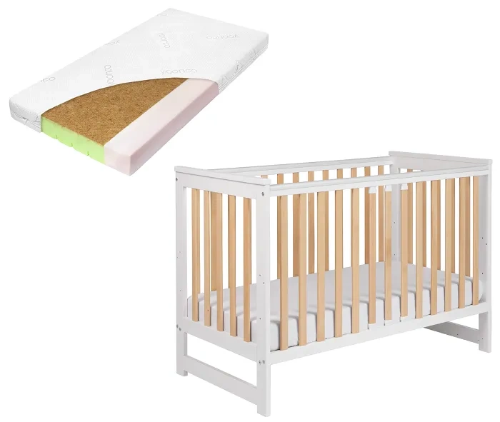 YOONCO - łóżeczko drewniane Iwi z barierką + materac Nature | Białe-Buk