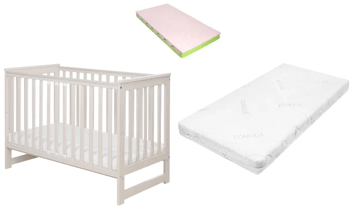 YOONCO - łóżeczko drewniane Iwi z barierką + materac Wave | Beż