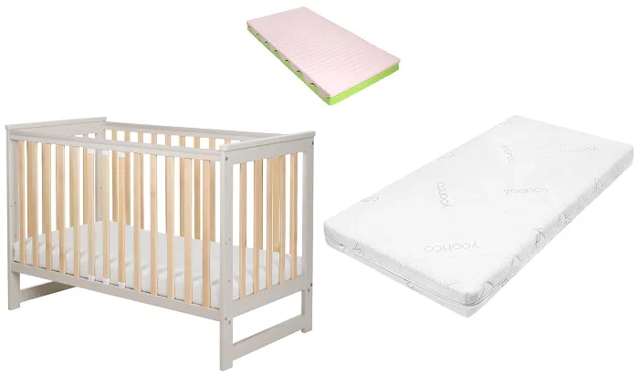YOONCO - łóżeczko drewniane Iwi z barierką + materac Wave | Beż-Buk
