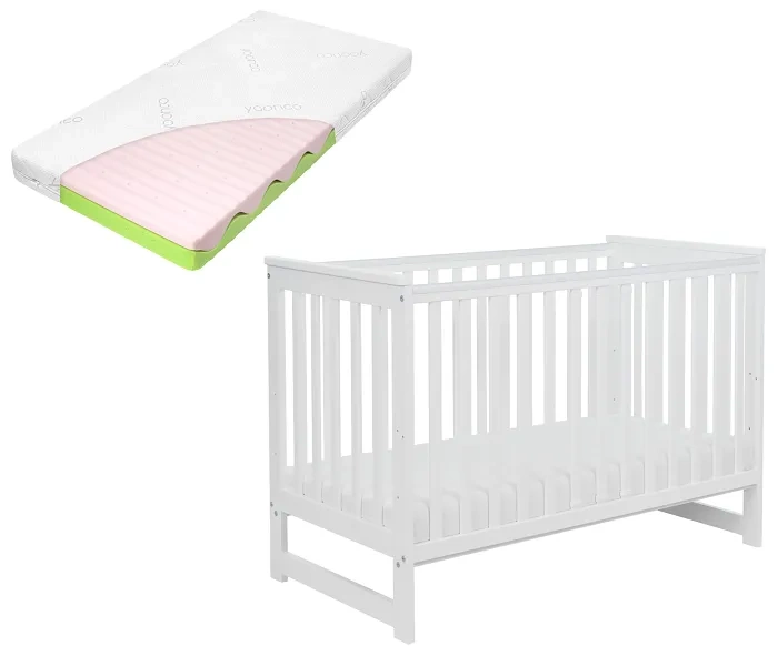YOONCO - łóżeczko drewniane Iwi z barierką + materac Wave | Białe