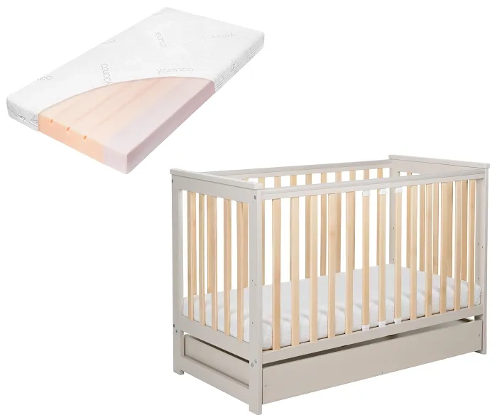 YOONCO - łóżeczko drewniane Iwi z szufladą i barierką + materac Air | Beż-Buk