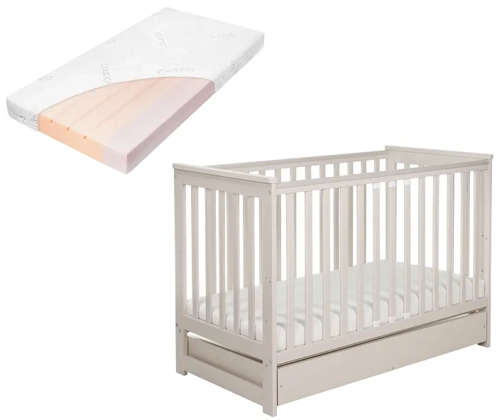 YOONCO - łóżeczko drewniane Iwi z szufladą i barierką + materac Air | Beżowe