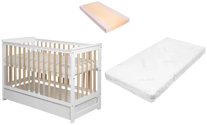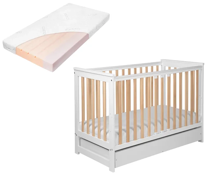 YOONCO - łóżeczko drewniane Iwi z szufladą i barierką + materac Air | Białe-Buk