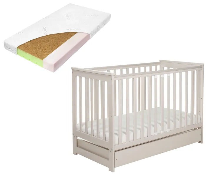 YOONCO - łóżeczko drewniane Iwi z szufladą i barierką + materac Nature | Beżowe