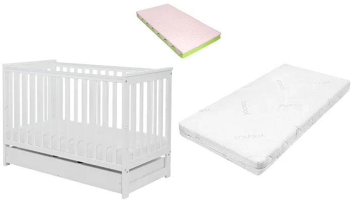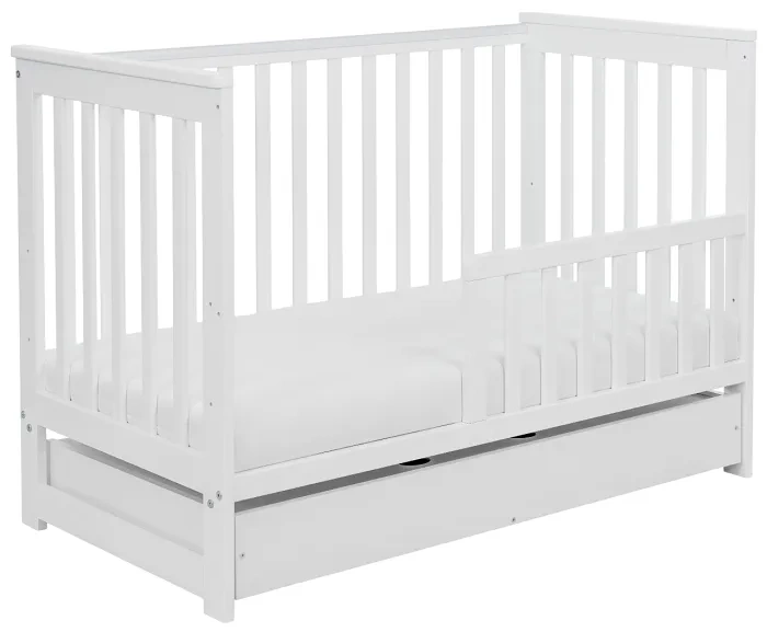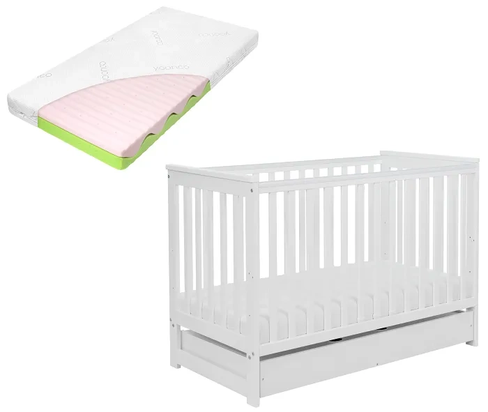 YOONCO - łóżeczko drewniane Iwi z szufladą i barierką + materac Wave | Białe
