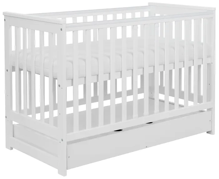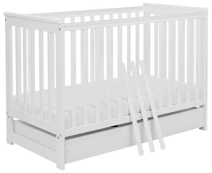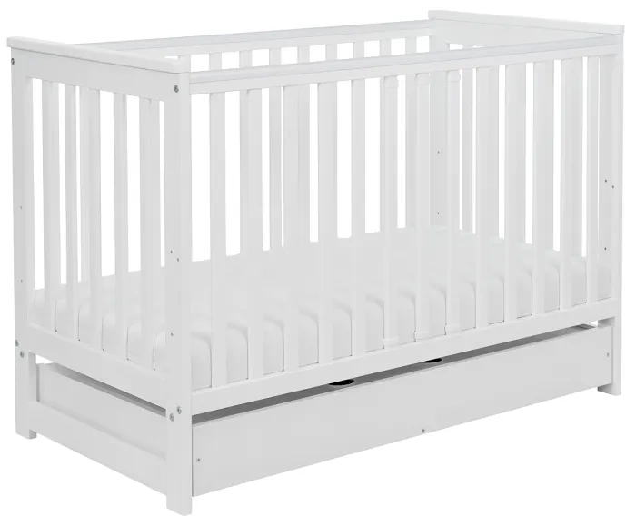 Wykonany z płyty meblowej pojemnik umieszczony w dolnej części łóżeczka to dodatkowa przestrzeń do przechowywania, idealna na zapasowe pieluszki, pościel czy ubranka maluszka.