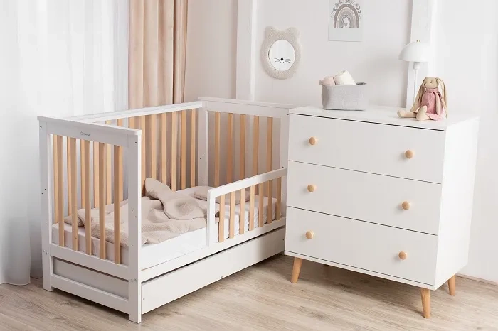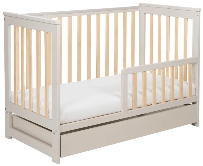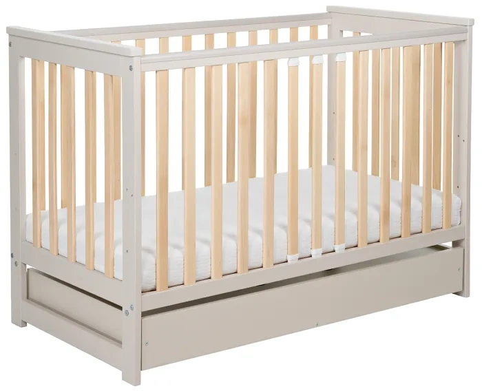Wykonany z płyty meblowej pojemnik umieszczony w dolnej części łóżeczka to dodatkowa przestrzeń do przechowywania, idealna na zapasowe pieluszki, pościel czy ubranka maluszka.