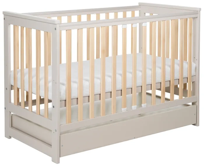 Dzięki wymiarom 120 × 60 cm oraz trzem poziomom regulacji wysokości dna, łóżeczko „rośnie” razem z dzieckiem.