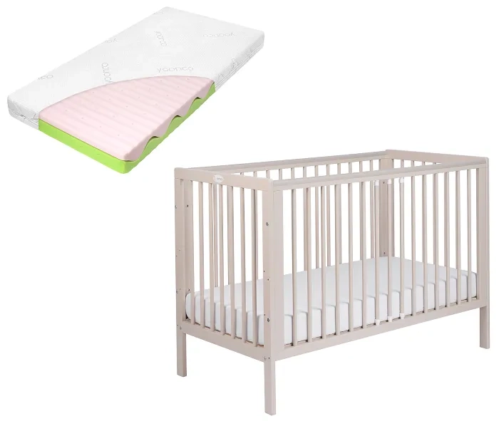 YOONCO - łóżeczko drewniane Timio z barierką + materac Wave | Beżowe