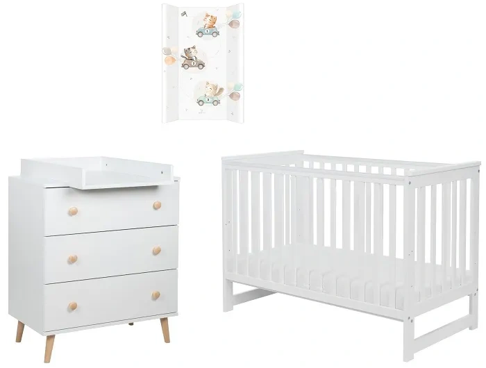 YOONCO - łóżeczko Iwi + komoda + przewijak miękki Kotek | Białe