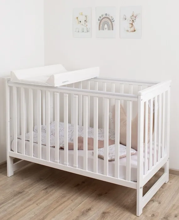Dzięki praktycznym osłonkom umieszczonym na długich bokach, mebel jest zabezpieczony przed uszkodzeniami - oraz śladami pierwszych ząbków, które potrafi pozostawić stojący w łóżeczku maluszek :)