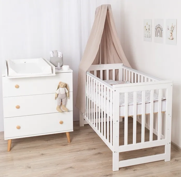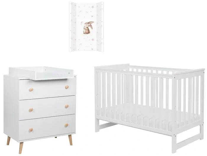 YOONCO - łóżeczko Iwi + komoda + przewijak miękki Króliczek | Białe