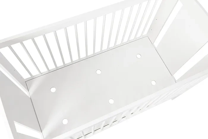 Łóżeczko Soni wykonano z płyty meblowej, płyty MDF oraz drewna sosnowego (szczebelki), co gwarantuje jego trwałość i stabilność.